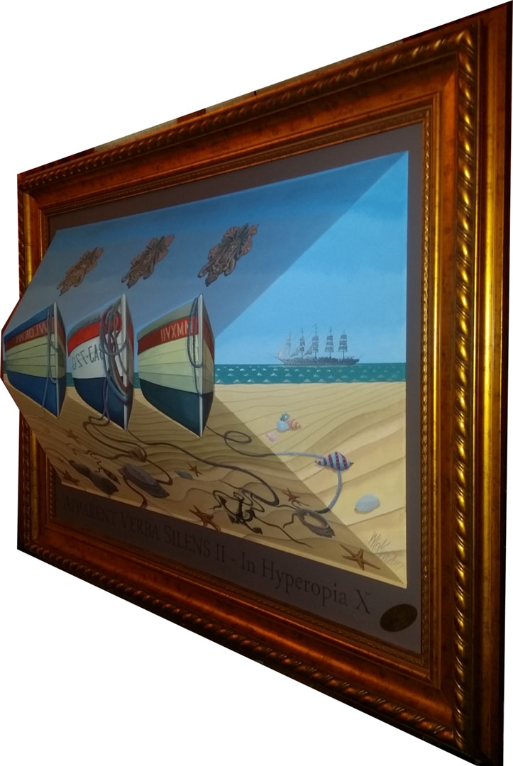 (Pozorne brzmienie ciszy II – W nadwzroczności X), wym. 100 x 70 x 22 [cm], ol.+akryl+deska. Dużo symboli, duże pole do ułożenia własnej historii. Powodzenia dla oglądających.